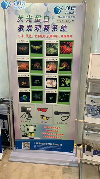 同時,在此次展會上,上海凈信還推出了一款沉淀已久的新產品—美國NightSea熒光蛋白激發(fā)觀察系統(tǒng),這是一款無需化學底物顯色,直接進行觀測,不損壞被檢測對象細胞的設備,擁有小巧、靈活、易攜帶、使用簡便等優(yōu)點,對于有轉基因實驗需求的科研人員,是一種特別“對胃口”的產品;其原理是發(fā)出的特種光源照射至生物表面時,佩戴專用濾光鏡(過濾掉大部分反射光只保留所需要的光源);便可實時觀察生物的基因變化狀態(tài),目前分為單光源和雙光源兩種型號。