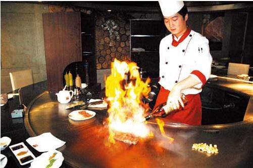 日式鐵板燒現(xiàn)場(chǎng)制作,食客還可在品嘗美味佳肴的同時(shí)欣賞廚師精湛廚藝。短鏟兩把、刀叉各一把,左手邊是銅帽蓋,右手有鹽、胡椒各種調(diào)料罐,這就是鐵板燒廚師所有的道具了。看廚師一邊翻滾著高溫區(qū)的牛排,同時(shí)還騷擾著保溫區(qū)的魷魚,忙里偷閑時(shí)再將刀叉、胡椒罐耍得眼花繚亂,讓人食欲大增。